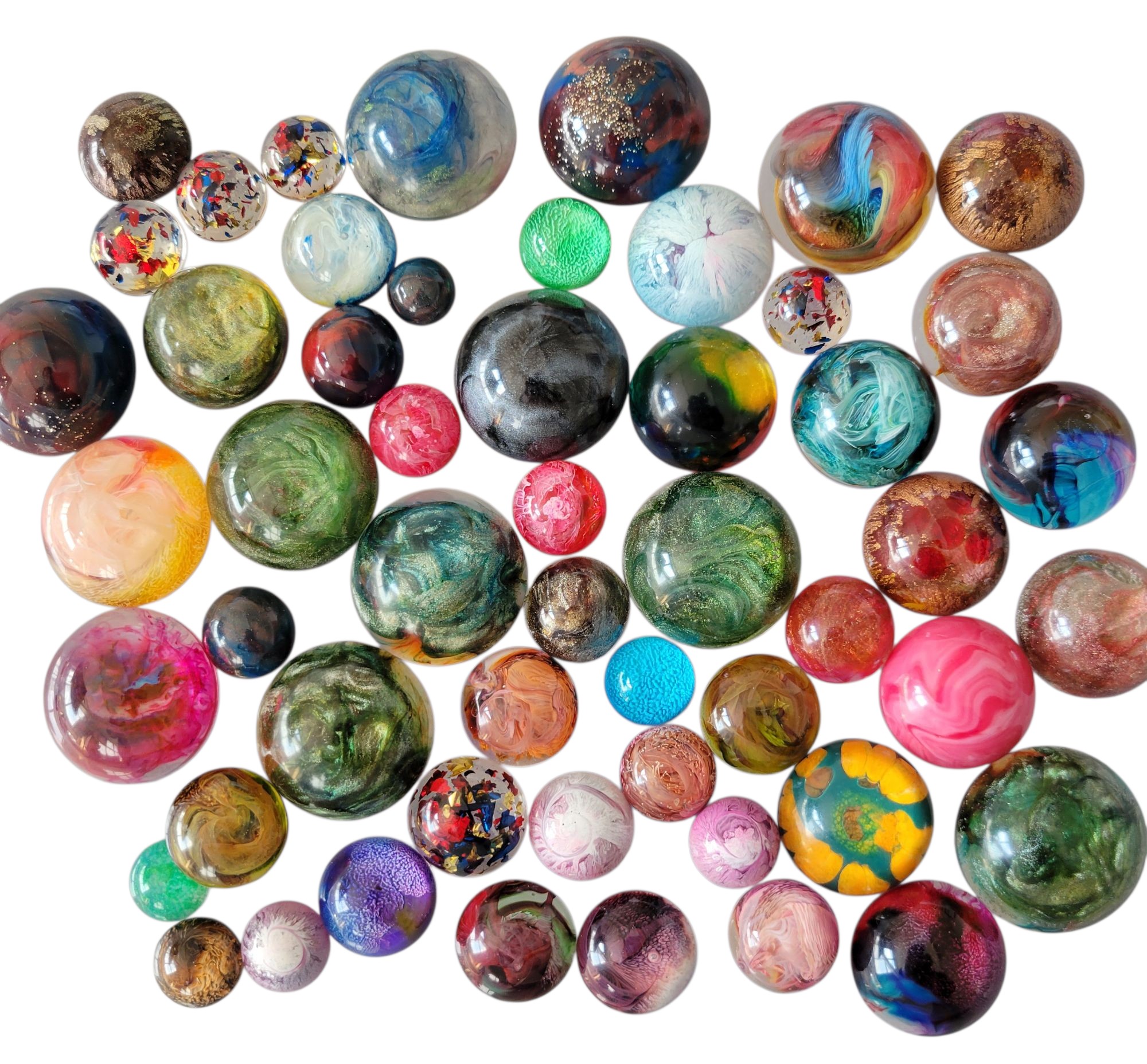 Add a touch of color, sparkle, and personality to your handmade jewelry with these beautiful resin cabochons. Each piece is carefully crafted with smooth, domed tops and flat backs, making them ideal for gluing into bezel settings, wire-wrapping, wrapping in macrame braid or setting in silver etc.