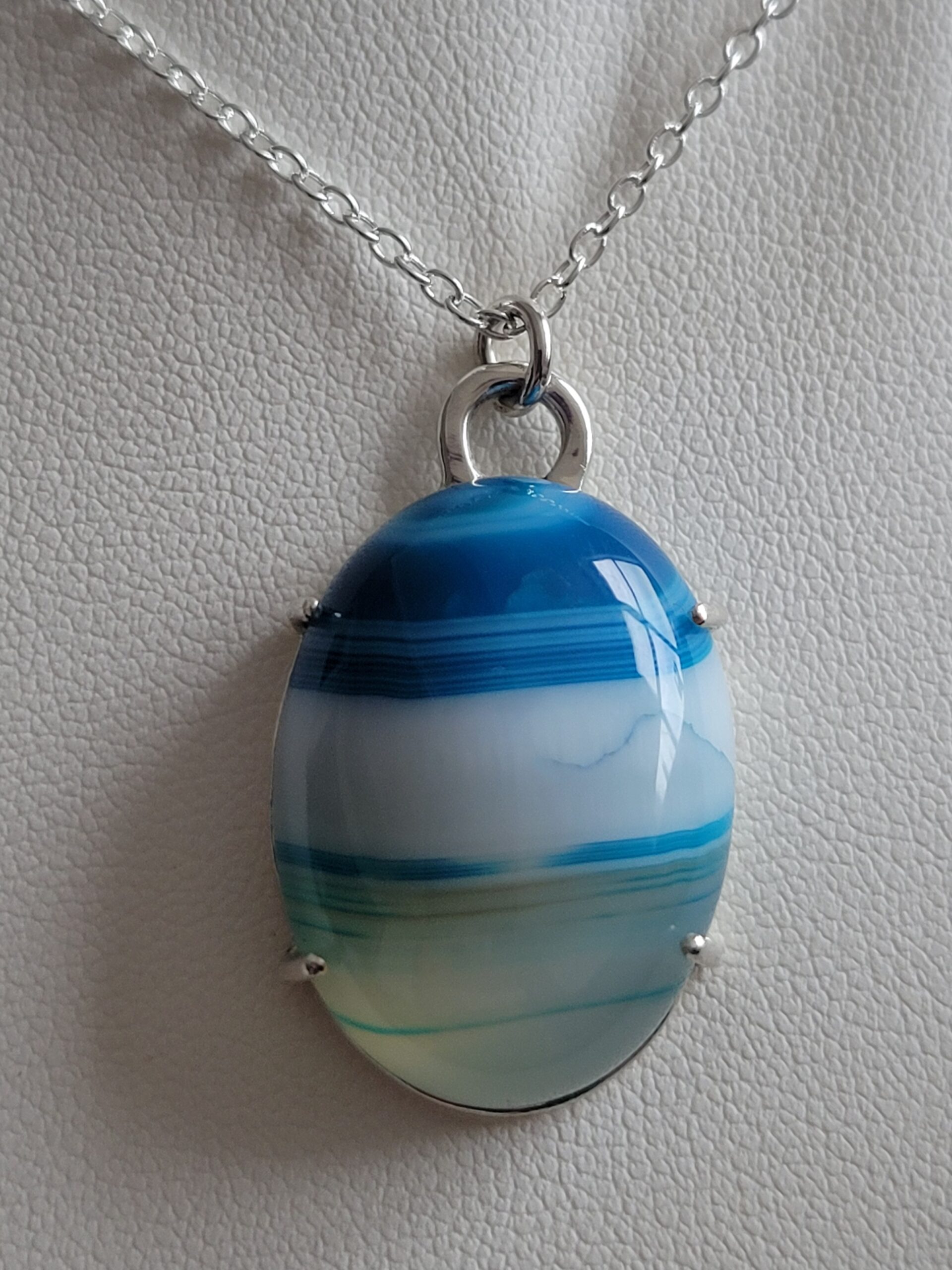 This Sterling silver blue striped agate necklace is made from 1.5mm silver and the blue striped agate stone is held in place with 4 claws.