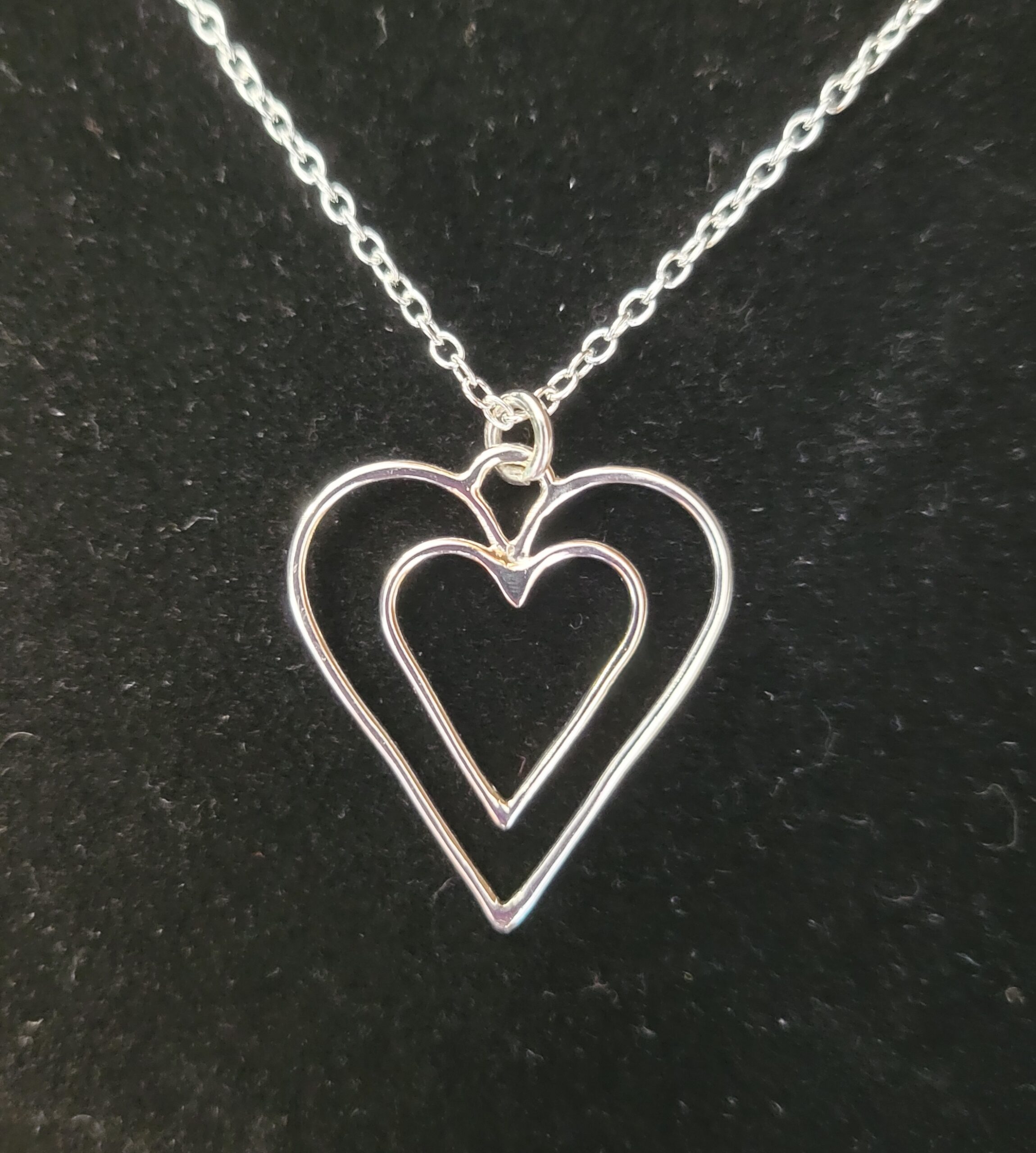 This sterling silver concentric heart necklace is made from 1.5mm silver. It has one heart inside the first one and attached at the top of each heart.