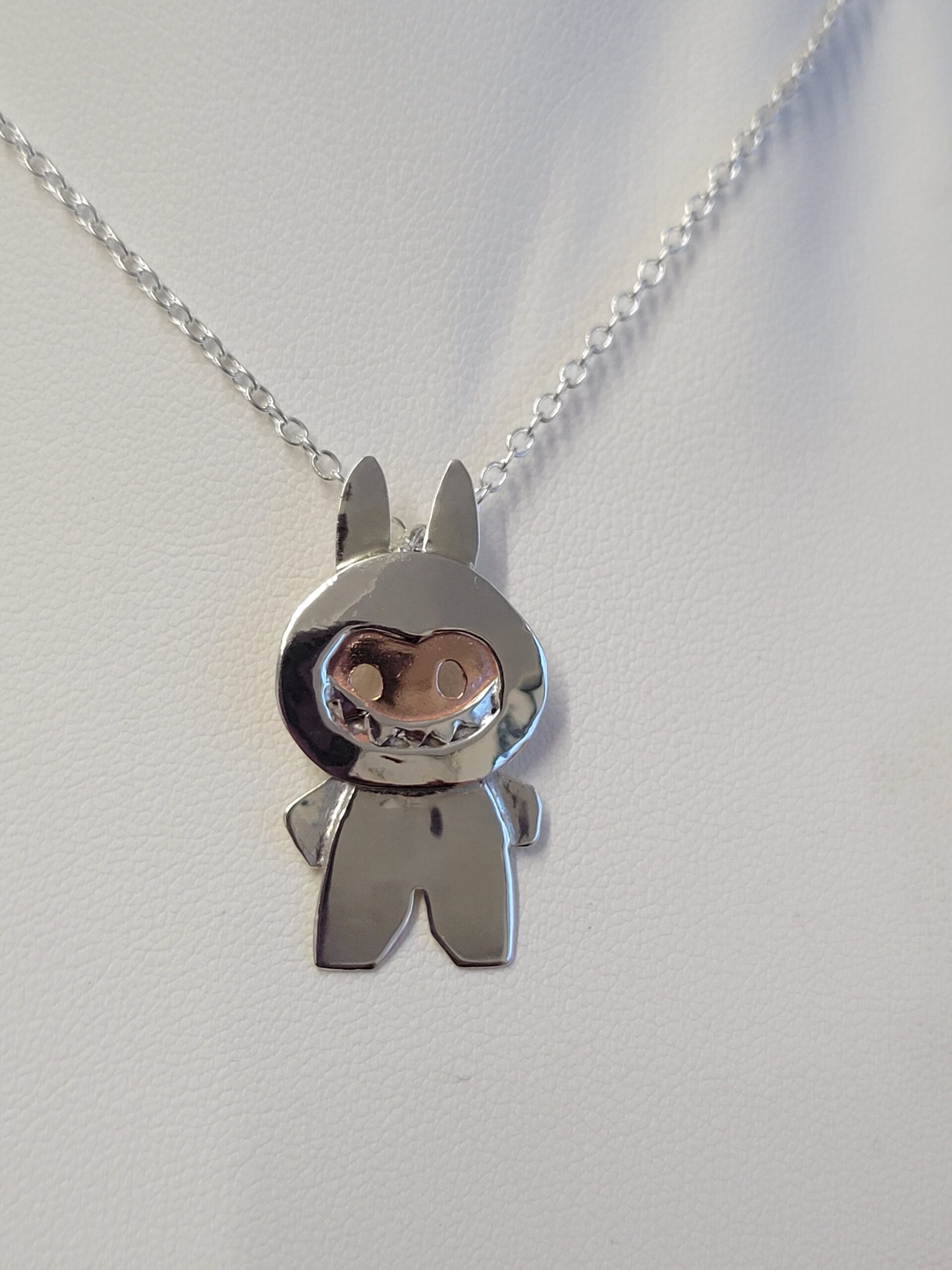 This Sterling silver Labubu style necklace is made from 0.5mm silver sheet and the face is made from 0.5mm copper sheet.